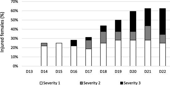 图 3 、非永久饲养组 D13 至 D22 受伤雌兔百分比。