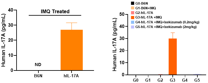 IMQ诱导会引起小鼠体内免疫细胞的激活和增殖,从而引起IL17A的表达量增加。经过Ixekizumab治疗后,B6-hIL-17A小鼠体内的人源IL-17A蛋白表达显著降低,其水平与正常小鼠相当。