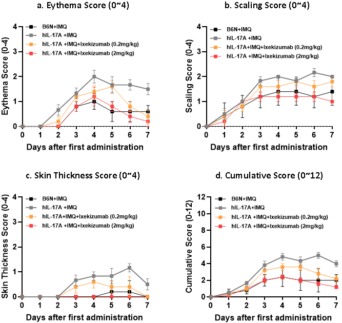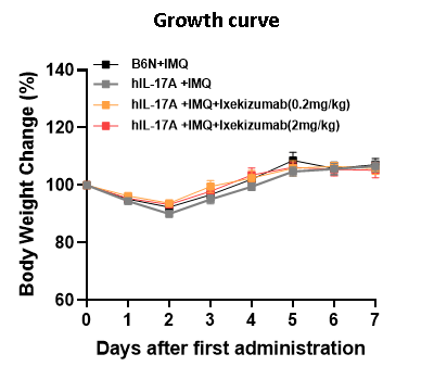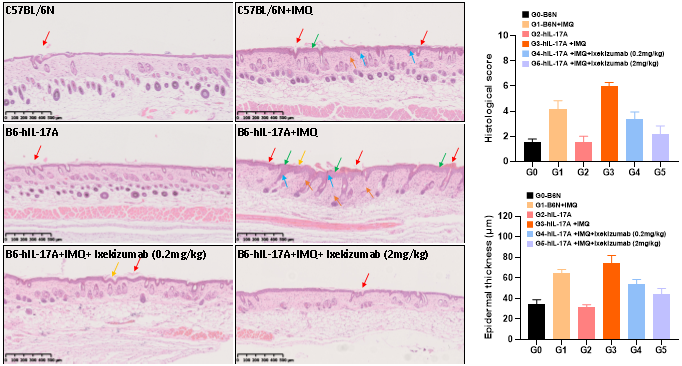 在正常情况下,B6-hIL-17A小鼠通过Elisa能检测到微量的人源IL-17A蛋白,咪喹莫特(IMQ)诱导后可以让这种小鼠高度表达人源IL-17A蛋白,并出现皮肤鳞屑、红斑和皮肤褶皱等银屑病样表型。Ixekizumab治疗可以有效抑制B6-hIL-17A小鼠中IMQ诱导的银屑病样组织学病理表型,并显著降低其体内人源IL-17A蛋白水平,其治疗效果呈剂量依赖性。因此,IMQ诱导的B6-hIL-17A小鼠可作为一种有效的模型,用于研究银屑病等IL-17A相关自身免疫性疾病的机制和评估靶向药物的药效。